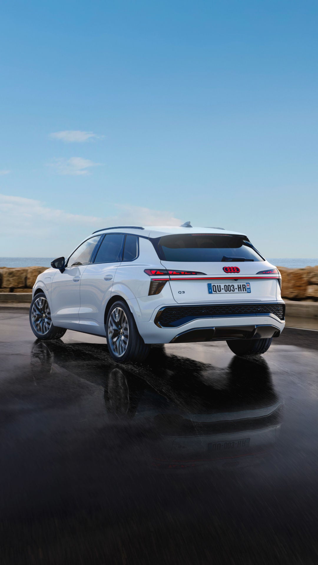 Gamme Audi Q3 e-hybrid : consommation électrique en cycle mixte WLTP (kWh/100 km) : 13,9 - 14,8. Consommation combinée en cycle mixte WLTP (l/100 km) : 1,7 - 2,1. Rejets de CO2 en cycle mixte (g/km) : 39 - 48. Autonomie 100 % électrique en cycle mixte WLTP (km) : 106 - 120. Valeurs liées à la configuration du véhicule et susceptibles d’évolution. Tarif au 15/09/2025.
