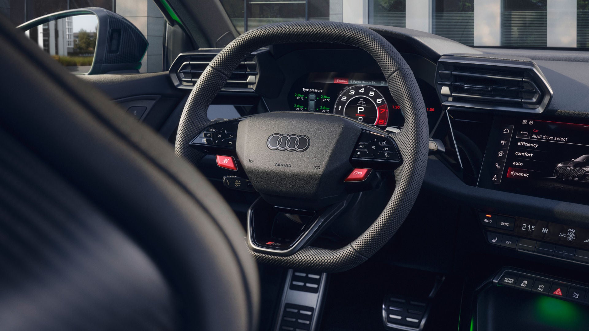 À l’intérieur chaque élément accentue le dynamisme du modèle. Les matériaux haut de gamme ainsi que les éléments exclusifs tels que le pack design RS plus disponible en rouge ou vert et l'Audi Virtual Cockpit plus avec option d'affichage RS font de la Nouvelle Audi RS 3 Sportback un modèle d’exception.